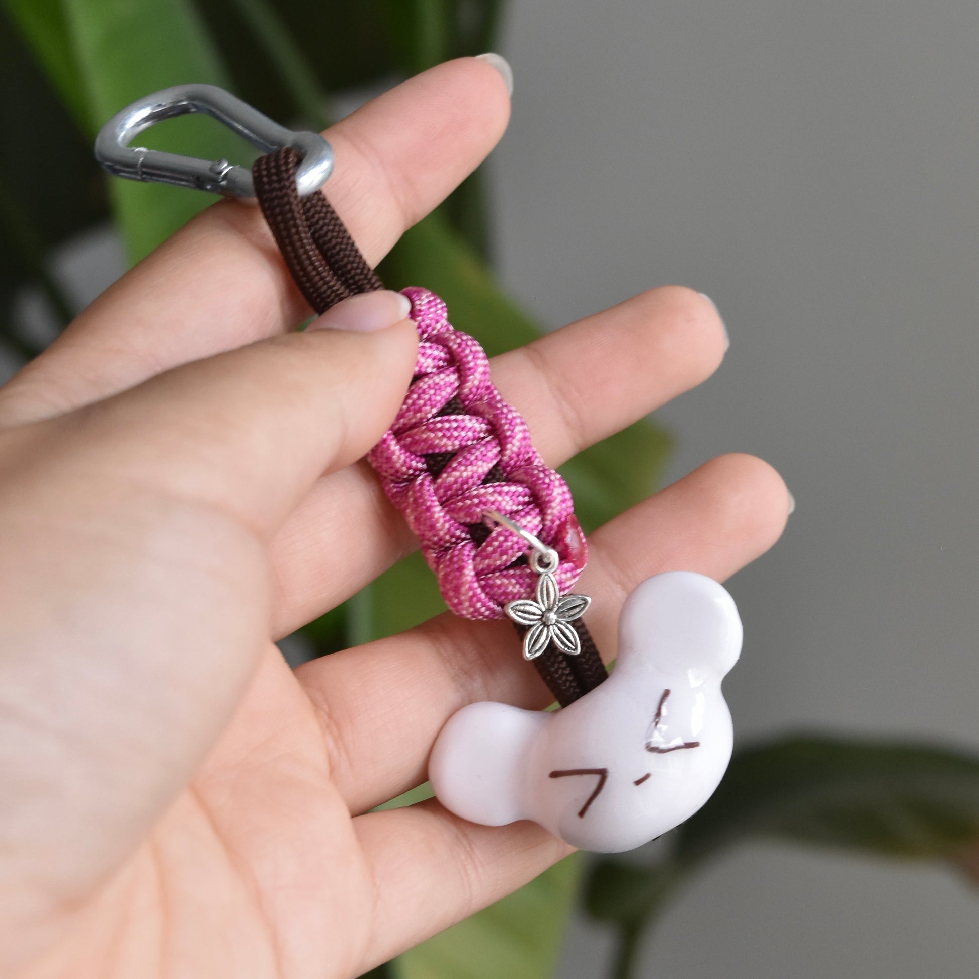Handmade sculpted charm using polymer clay and varnished using UV resin for shine and durability. With carabiner and flower charm. Rope also hand knotted.