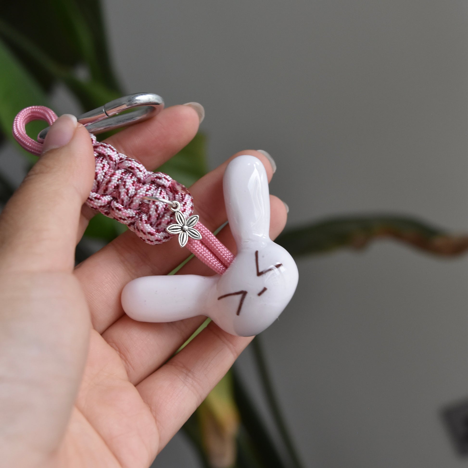 Handmade sculpted charm using polymer clay and varnished using UV resin for shine and durability. With carabiner and flower charm. Rope also hand knotted.